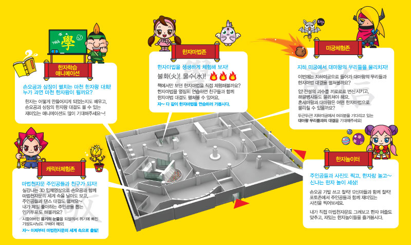 원작의 스토리텔링을 기초로 한 전시공간 기획부터 동선 시나리오, 존별 컨텐츠 및 한자학습 애니메이션등을 개발하였으며 크게 케릭터체험존, 한자학습 애니메이션, 한자마법존, 미궁체험존, 한자놀이터존으로 구성된 전시공간은 맞춤형 프로그래밍을 통하여 차별화된 컨텐츠를 선보이게 되었다. |