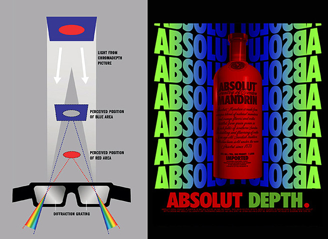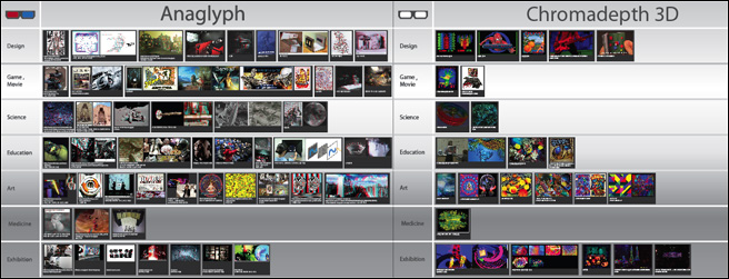 | 일반적인 2D 이미지에서도 입체 효과를 볼수 있도록 고안된 미국 Chromatek사의 크로마뎁스 3D(Chromadepth 3D) 방식은 색깔의 선택 사향에 따라 충분한 입체 효과를 느낄 수 있도록 고안되었으며 아래그림 예시에서와 같이 빨강색이 가장 앞으로 튀어나오는 효과를 주며 기타 다른색은 빨간색 보다 멀리있게끔 인지 되는 방식이다. 렌티큘러 방식이나 애너그리프와 달리 콘텐츠 자체의 색상만으로도 풍부한 입체감을 나타낼 수 있는 장점이 있다고 하겠다. |