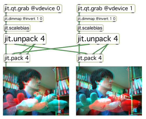 이러한 개념을 cycling74의 Max/MSP Jitter에서 프로그래밍하면 아래 패치와 같다. 다시말하면 적청안경이나 청적안경에 모두 대응할 수 있는 실시간 반응형 애너그리프 입체구현이 가능해 진다. 따라서 카메라 및 편집된 동영상, 기타 스틸 이미지 까지 모두 입체소스가 될 수 있으며 전시에 특화된 간단한 입체 시스템을 구축할 수 있다. |