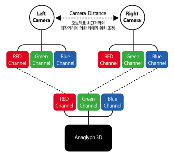 애너그리프(Anaglyph) 입체구현 방식은 좌우측 카메라가 위치하는 거리간격과 좌측 카메라의 RED Channel 우측 카메라의 RED Channel과 대치됨으로서 구현된다. |