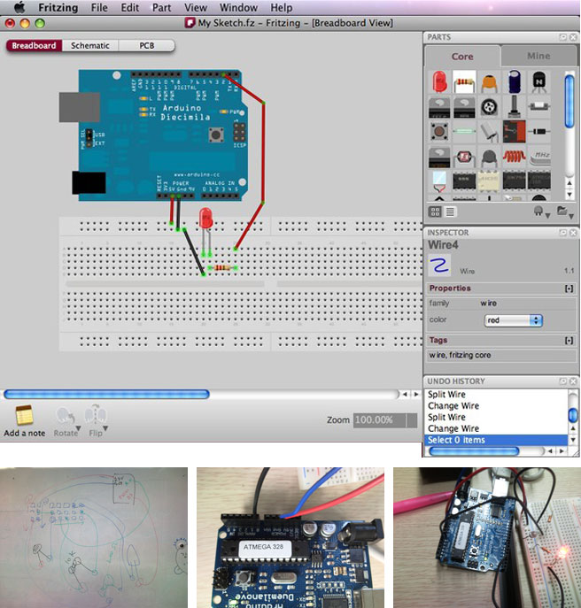자신의 아이디어를 실제 제작하기전에 먼저 가상으로 세팅해볼 수 있는 Fritzing 툴을 활용하여 다이어그램을 먼저 구현한다. |