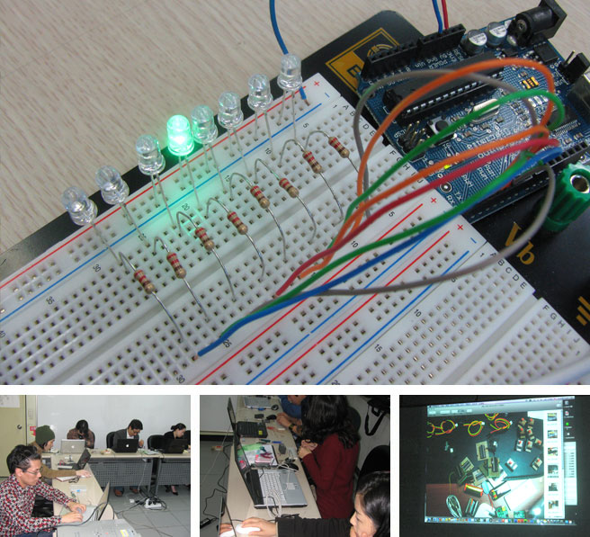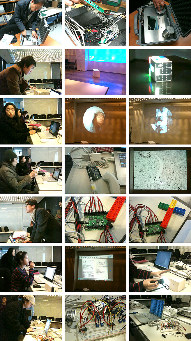 아두이노 프로젝트(Arduino Project)는 아두이노 보드만의 디지털, 아날로그 입출력 시스템을 활용, Max/MSP와 연동하고 커뮤니케이션의 확장을 실험하는 프로젝트입니다. iCube System처럼 고가의 장비와 독자적 포멧의 센서가 상상력의 한계를 주었다면 아두이노를 활용한 센서와 유연한 입출력 방법들은 관람자와 개발자간의 다양한 커뮤니케이션과 환경을 구축할 수 있었습니다. 장단점이 분명히 존재하지만 자신의 상상을 프로토타입으로 구체화하는데 있어서 도움을 주는 디바이스라고 하겠습니다. |