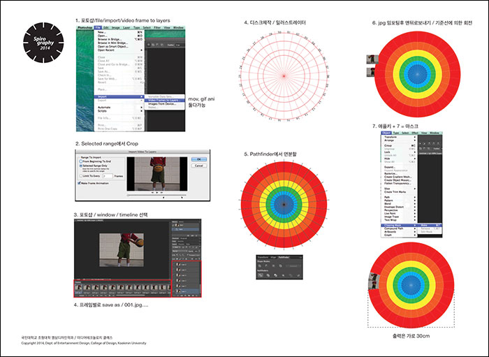| 스피로그래피 2014프로젝트는 페나키토스코프를 활용한 2번째 프로젝트로서 보다 다양한 실험과 결과물이 도출될수 있도록 미디어테크놀로지디자인클래스에서 진행된 결과물이다. 아날로그 시각으로는 인지되지 않지만 디지털 과정을 거쳐야 애니메이션으로 인지되는 차별성과 감성을 부각시키려 하였다. 다음은 단계별 프로세스를 요약 정리한 것이다. 2014.5 오승환 |